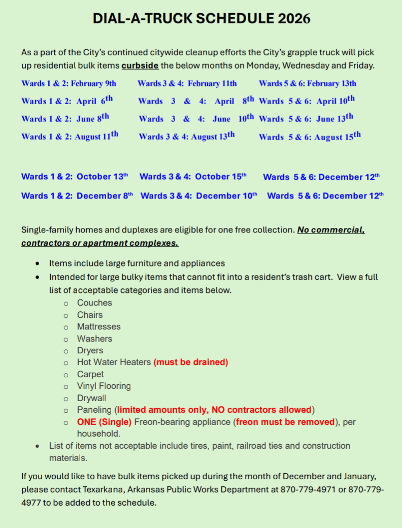 The Refuse Division is responsible for the safe, efficient, and environmentally responsible collection and disposal of solid waste throughout the city. Its primary purpose is to maintain public health and cleanliness by providing regular residential and commercial trash pickup, recycling services, bulk waste collection, and seasonal cleanup programs.